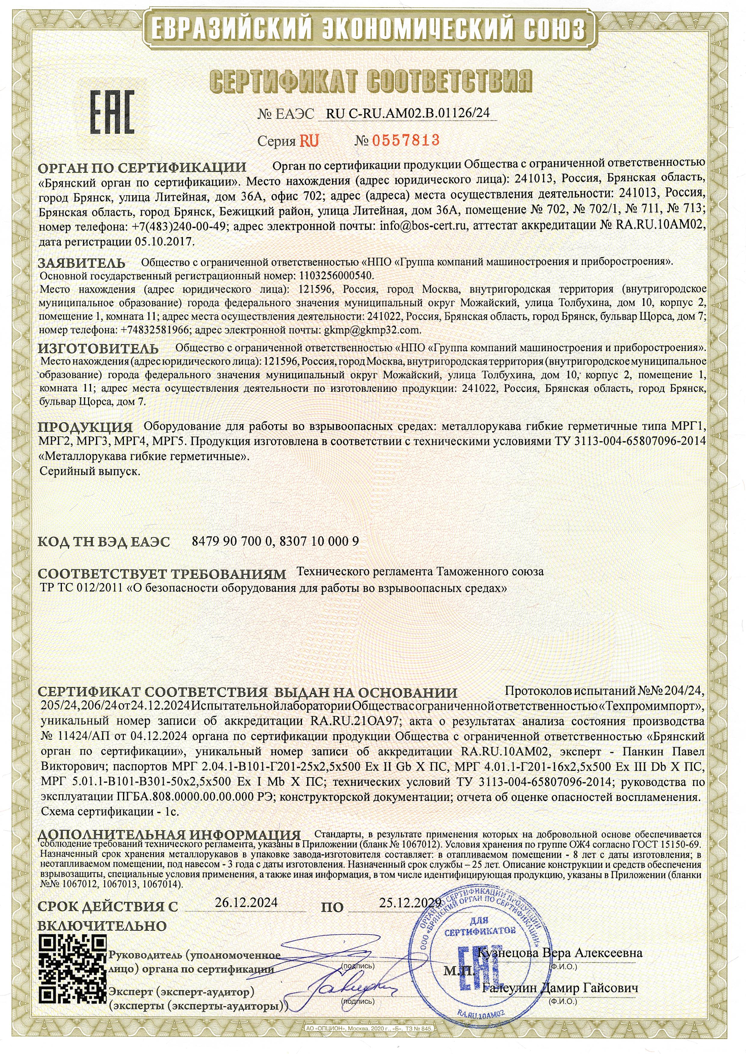 Оборудование для работы во взрывоопасных средах: металлорукава гибкие герметичные типа МРГ1, МРГ2, МРГЗ, МРГ4