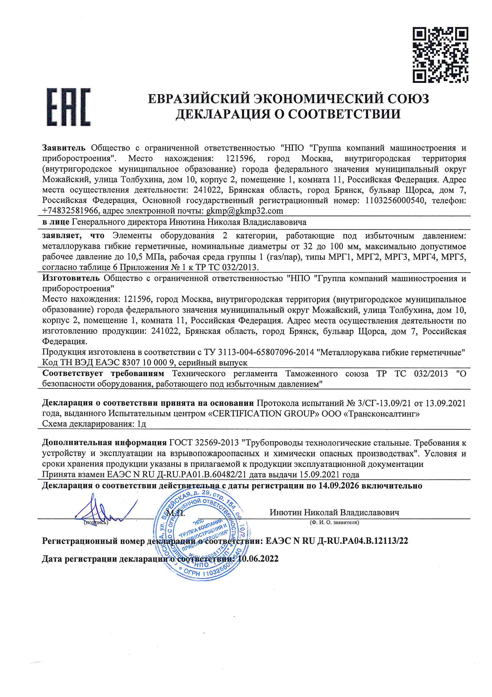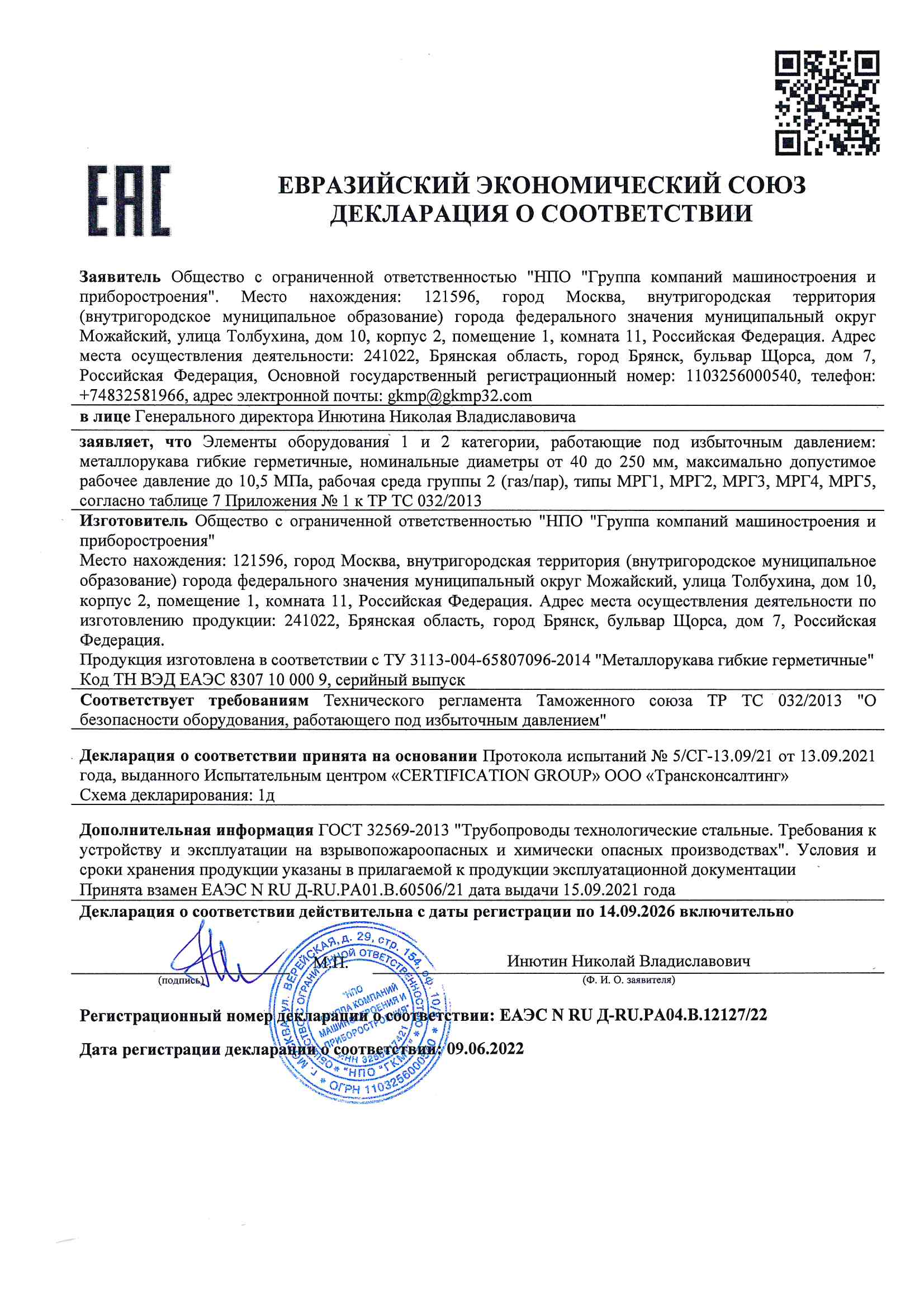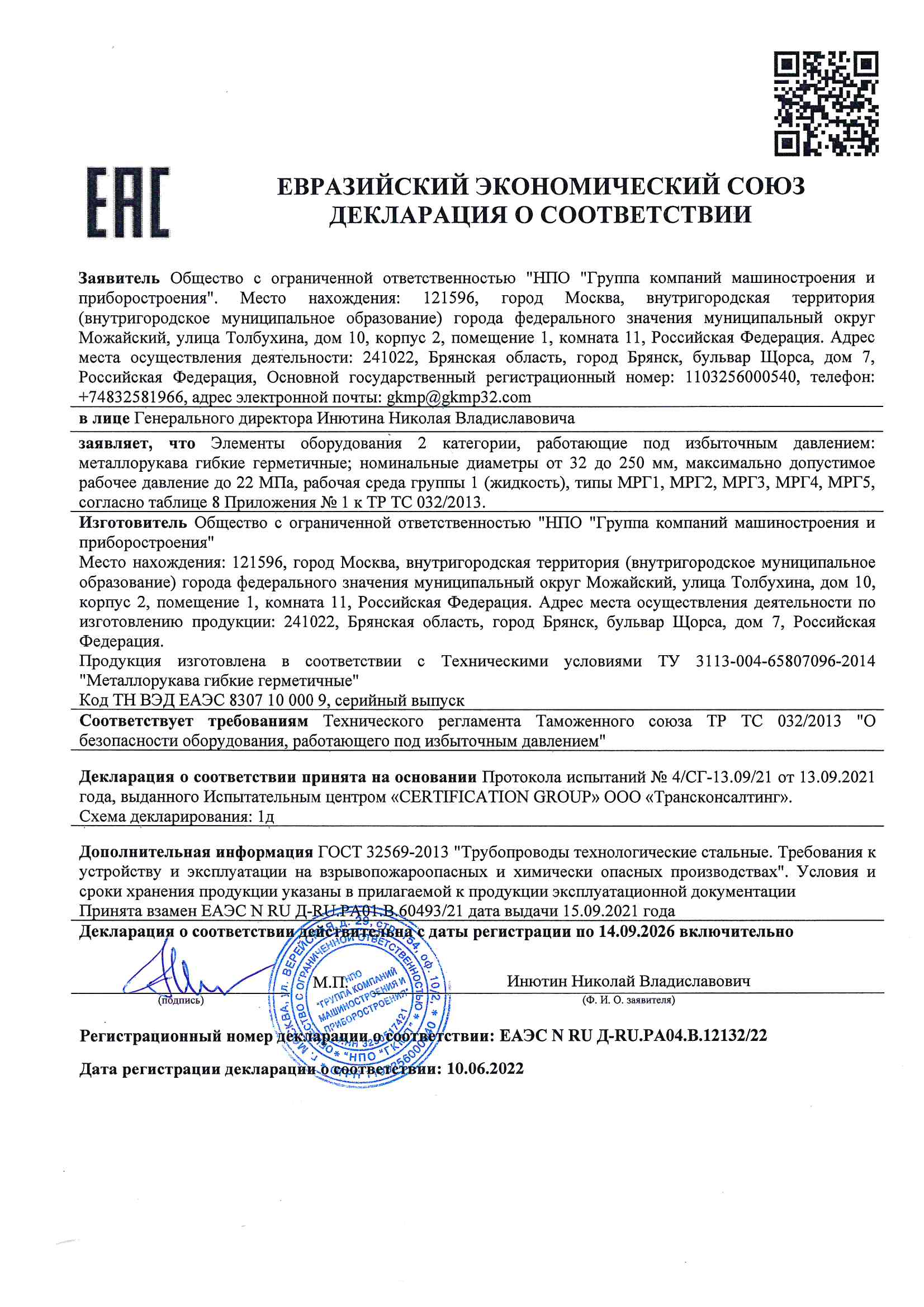 Декларации ТР ТС на металлорукава высокого давления (жидкости) 22 Мпа