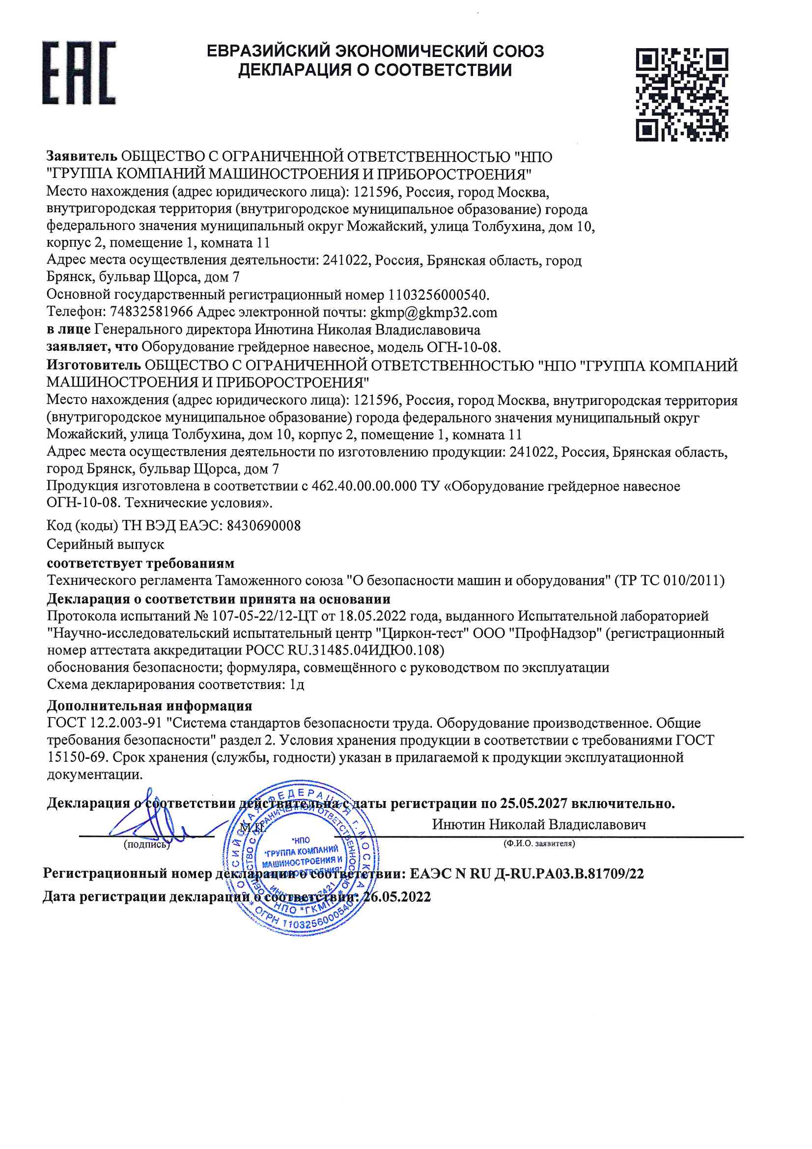 Декларация ТР ТС на Оборудование грейдерное ОГН-10-08