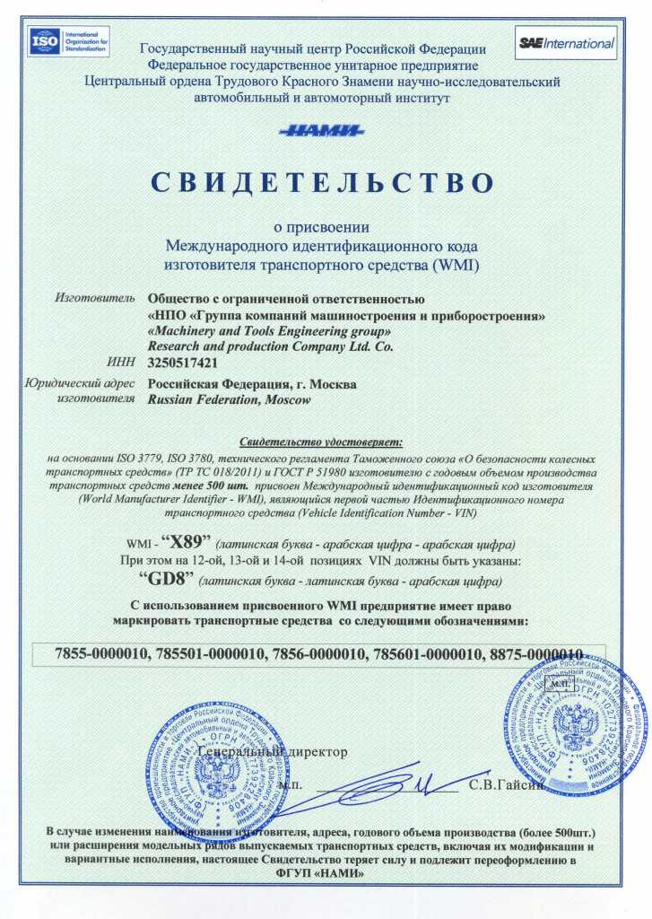Свидетельство о присвоении Международного идентификационного кода изготовителя транспортного средства (WМI)