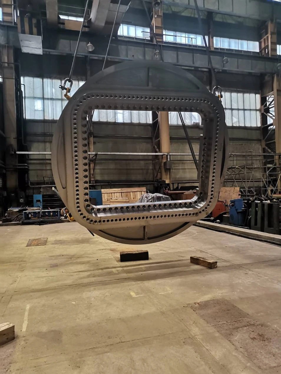 Передний фланец - сложность данного элемента заключается в точности изготовления - требовалось обеспечить плоскостность на поверхности герметизации 0.3 мм на 3.5 м, что было достигнуто и проверено с помощью лазерного трекера. Далее передний фланец должен быть аккуратно спозиционирован и приварен к обечайкам.Проектирование и работы требуют особого мастерства, так как в дальнейшем необходимо располагать возможностью контролировать данную конструкцию.