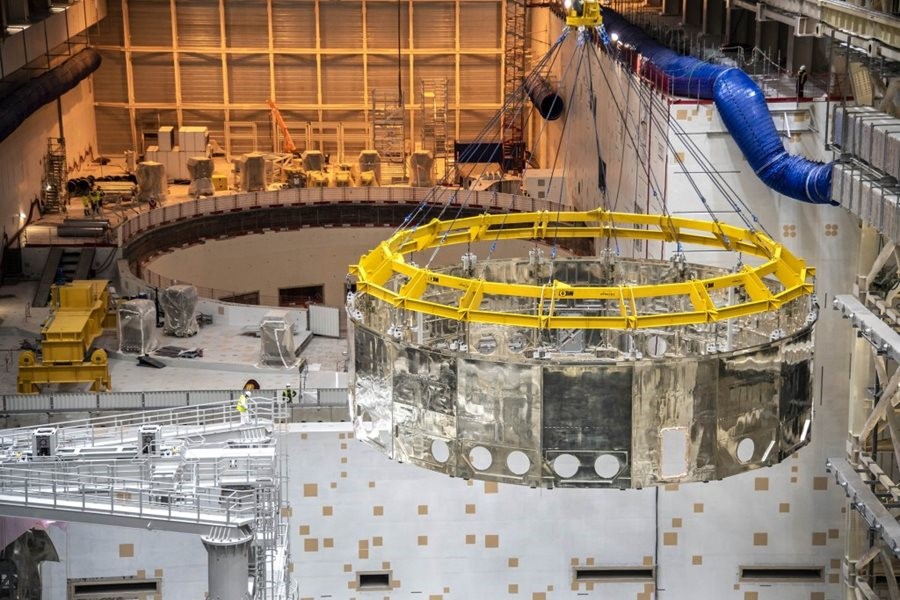 После установки днища криостата и нижнего цилиндра в мае и августе прошлого года, соответственно, проведенная в четверг, 14 января операция стала еще одним важным моментом в сборке устройства проекта ИТЭР. Сам внешний вид компонента: его хрупкость и тонкость, серебристая поверхность, отражающая цвета и неидеальные формы окружающей среды - все это способствовало изяществу данного события. В известной теперь последовательности сначала поднимали груз на несколько сантиметров, проверяли его баланс, производили метрологические измерения, и только потом поднимали его на крейсерскую высоту примерно на 23 метра высотой над полом сборочного цеха.