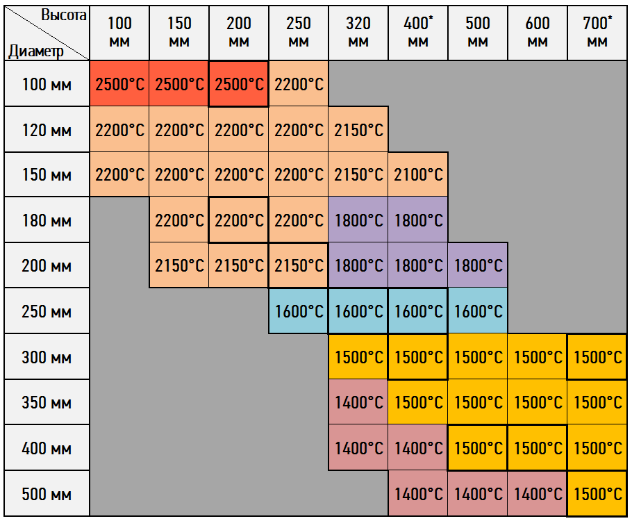 Стандартные габариты рабочей зоны и максимальные температуры: