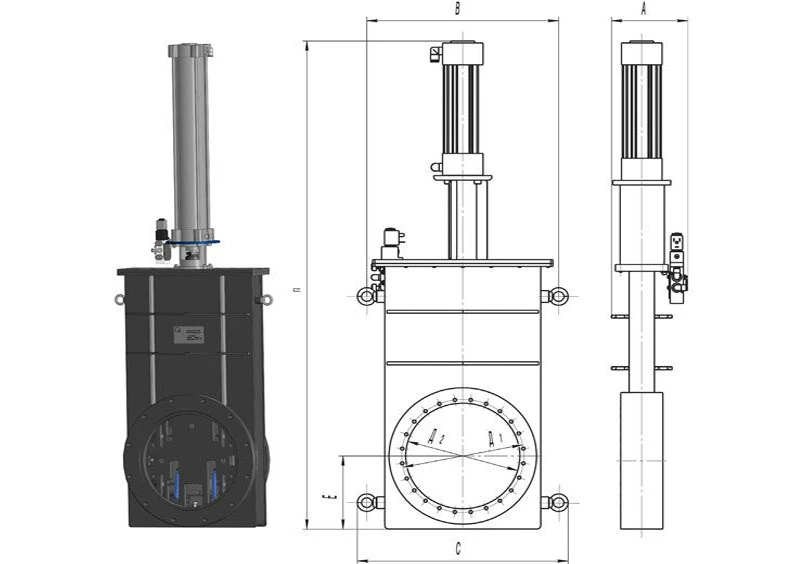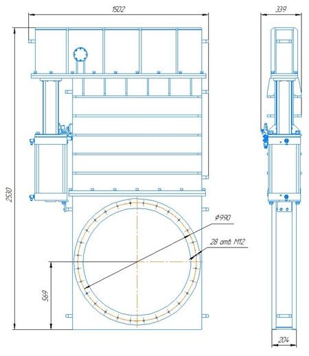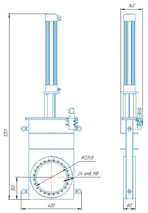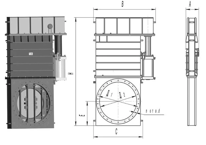 Общий вид затворов с резиновым уплотнением с верхним расположением пневмоцилиндра.